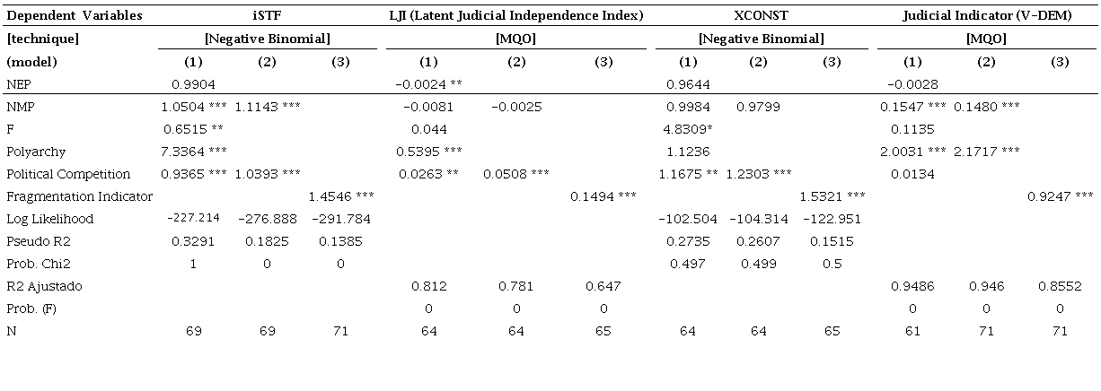 The data corroborate the hypotheses that the greater the political and party fragmentation, the greater the tendency for the Judiciary to be empowered. For the test of the iSTF indicator, the variables NMP and Political Competition showed a positive impact on the indicator. As the values are exponentialized, the interpretation is that the increase of one unit in the minimum number of parties increases the chance of the Judiciary being strengthened by 11,43%. The increase of one unit in political competition, on the other hand, increases the chance of 3.93%. The fragmentation indicator is more complex, as it varies in standard deviations. Therefore, the increase of a standard deviation in the indicator produces a 45,46% chance increase in the iSTF indicator. The most intuitive is to stick with model two. In any case, both model 2 and model 3 show that the greater the political and party fragmentation, the stronger the judiciary becomes.