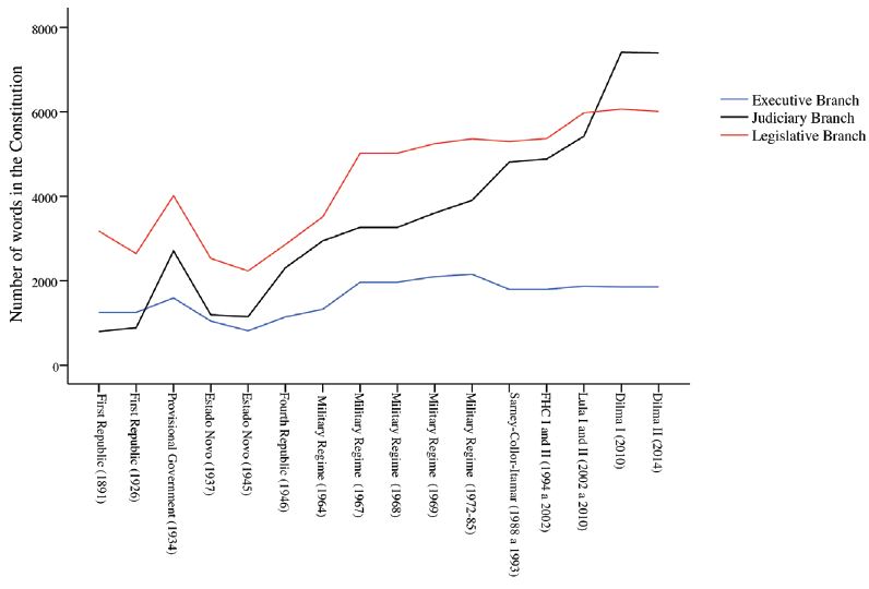 This new configuration in the theory of separation of powers endowed the Judiciary with a role previously unheard of, which, by strengthening institutionally the body through constitutional rules, allowed Judges to start to interfere with more force and frequency in the political arena. As Lijphart (2003, p. 258) pointed out, if a body is created with the sole purpose of examining the constitutionality of the legislation, it is very likely that it will perform this task with some vitality. The Brazilian case is even more interesting, since its supreme court, the Supreme Federal Court - STF, is not a body with a single aim in analyze the constitutionality of norms and rules. He also acts as an ordinary appellate body in cases where he is the original body for actions against certain public authorities, in addition to assessing extraordinary appeals, where he exercises diffuse judicial review and also acts as a concentrated judicial reviewer. In other words, the Brazilian model is a hybrid model that united the North American model and the Kelsen model. However, this model was built over time, gradually and incrementally. The STF was not always so powerful, as demonstrated by Aliomar Baleeiro in the work “O Supremo Tribunal Federal, esse outro desconhecido” (The Supreme Federal Court, this other unknown), published in 1968 ( Baleeiro 1968). The Graph 1 illustrates this evolution over time. The y-axis represents the number of words contained in the section dedicated to the Judiciary in each Constitution by presidential mandates (x-axis) due to the changes made by constitutions and constitutional amendments. Thus, it was possible to capture the “size” of each of the three powers, allowing their comparison. The graph shows that the year 2004 (Lula 2003-2010) was the moment when the Judiciary (black line) overtook the Legislative (red line). The Executive is represented by the blue line. It was in that year that there was a reform of the judiciary (Amendment 45 of 2004), with the creation of the National Justice Council, making the control of the central Judiciary to become even stronger.