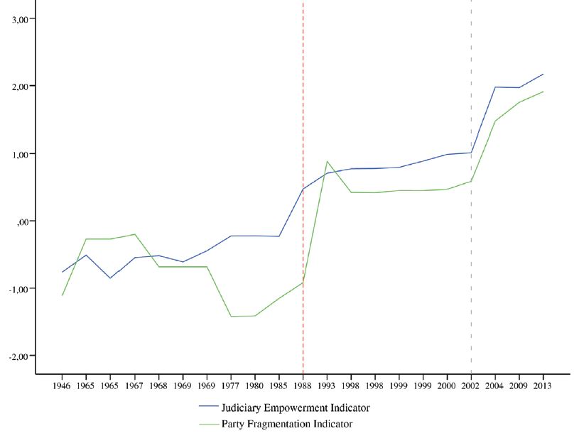 In the Graph 2, the y-axis is represented by the factored indicators, while the x-axis represents the year of constitutional changes (by Constitution and by amendments). The red dotted line signifies the point of no return, that is, after the 1988 Constitution there is no way for the Executive and/or Legislative to go back and diminish the powers of the Judiciary, unless it agrees with this reduction, which is very unlikely. Once the STF is in charge of controlling constitutional changes, any attempt to reduce its power through a Constitutional Amendment will be up to it to decide on its own reduction of power. This event specifically shows that, within the current constitutional order, it is the STF that decides on its own powers, being responsible for making a self-restraint ( Graph 1 shows that there is no reduction of power after 1988). The gray dotted line, on the other hand, illustrates Koerner’s 2013 argument, exactly when the indicators of party fragmentation and judicial empowerment are aligned over time. This alignment suggests an extremely strong correlation between party fragmentation and judicial empowerment.
