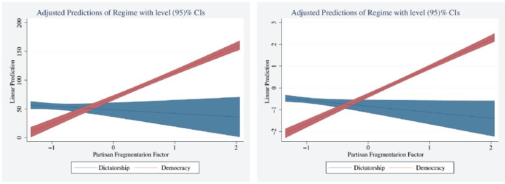 It is evident that democratic governments contributed much more to the slope of the adjustment line than dictatorial governments (as illustrated in the Graph 3), which corroborates Ginsburg’s argument. This will be made even clearer in section 4, where the data will provide even more robust responses. So far, both Ginsburg and Ferejohn have made a solid contribution to formulating the hypothesis that the greater the party fragmentation, the greater the empowerment of the judiciary.