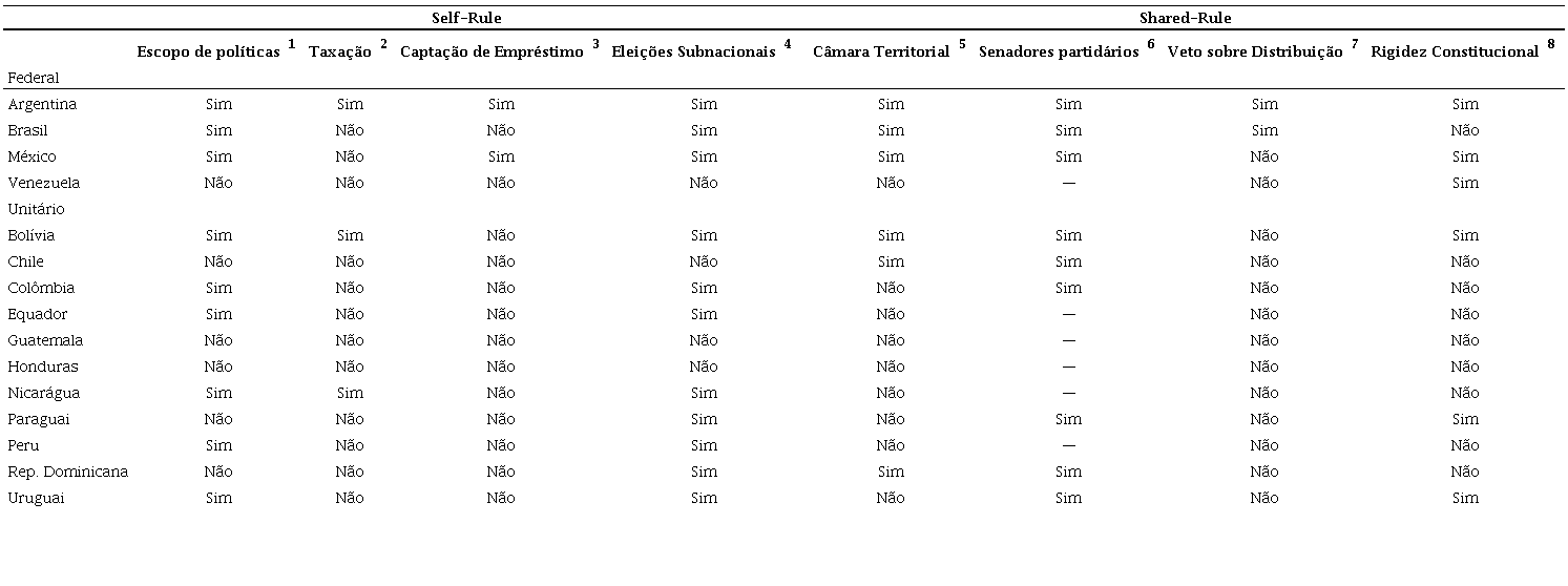 Materiais e Métodos: O estudo adota duas categorias analíticas: self-rule (a extensão em que os Estados têm autoridade em seu próprio território) e shared-rule (a extensão em que os Estados participam das decisões nacionais). Para testar empiricamente esses conceitos, a categoria self-rule foi desdobrada em quatro subcategorias analíticas: (i) o escopo de políticas atribuídas aos governos estaduais; (ii) a autoridade dos governos estaduais sobre seus próprios impostos; (iii) a autoridade dos governos estaduais para tomar empréstimos e (iv) as regras eleitorais para escolha dos governos estaduais. A categoria shared-rule também foi desdobrada em quatro subcategorias: (i) a simetria entre as duas câmaras; (ii) a regra de escolha dos senadores; (iii) o poder de veto dos Estados às regras de redistribuição de recursos e (iv) a rigidez constitucional. Os Estados latino-americanos, federativos e unitários, foram observados, de modo a testar empiricamente se suas estruturas de governança correspondem a clusters distintos de instituições políticas.