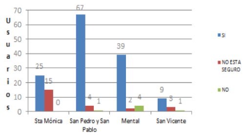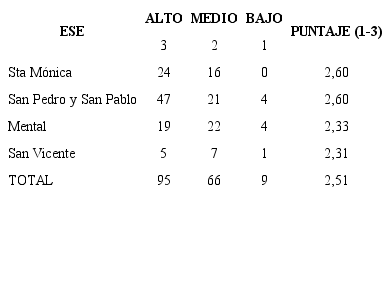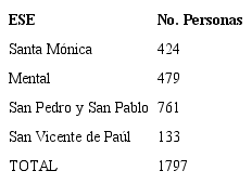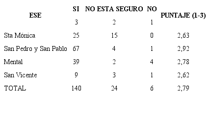 Se obtuvo un puntaje del 90% de la máxima puntuación posible, significando un buen nivel de conformidad con los servicios (existen externalidades geográficas que reiteran la atención médica en las ESE regionales). Según la Tabla 3, el Hospital San Pedro y San Pablo fue la ESE con mejor calificación en cuanto a usos reiterados de servicios de urgencias, seguidos por el Hospital Mental, el de Santa Mónica y San Vicente.