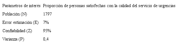 La población interés para evaluar la percepción de calidad del servicio desde la demanda, estuvo conformada por usuarios atendidos y registrados en los servicios de urgencias de cuatro ESE de II nivel del departamento de Risaralda, durante el primero de enero al 30 de junio de 2013, Descritos en la tabla No. 1 (Marco de muestreo)