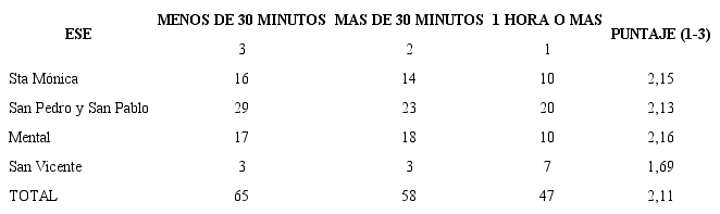 Cuando se compararon los modelos internacionales de triaje con el modelo colombiano, se encontró que este es más exigente en cuanto al tiempo establecido para la atención de pacientes que ingresan a urgencias. Ninguna de las ESE sobrepasó en sus valoraciones el 60% de la calificación máxima posible. De todos modos, la ESE mejor calificada fue el Hospital Mental, seguida por los Hospitales Santa Mónica, San Pedro y San Pablo y San Vicente (Tabla 2).