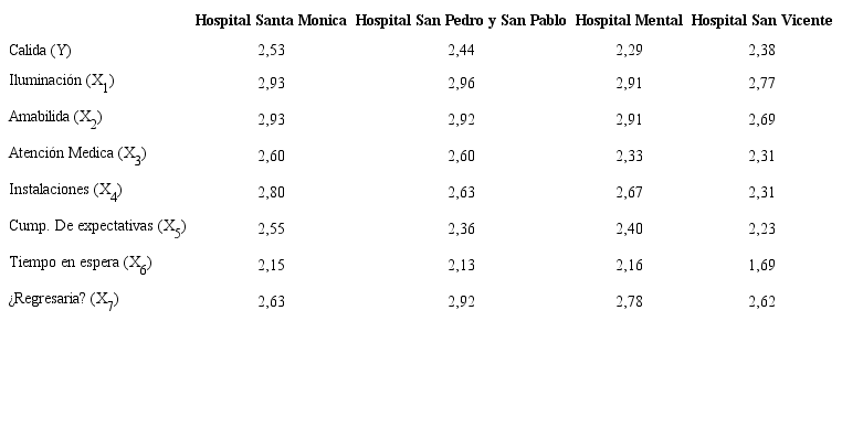 Según se evidencia en la Tabla 4, las variables de la dimensión estructura fueron las mejor calificadas, seguidas de las dimensiones proceso y resultado, respectivamente. Sobresale la variable tiempo de espera, la cual fue la peor calificada en todos los hospitales objeto de estudio.