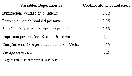 La "Satisfacción por la atención médica" fue la variable independiente que mejor explicó el comportamiento de la variable dependiente en el estudio, seguida de la variable "expectativas". Asimismo, y en contraposición a la afirmación de los funcionarios del lado de la oferta, la variable que menos explicó la calidad en los servicios de urgencias fue el tiempo de espera. En este sentido, el modelo de triaje que preconiza el gobierno colombiano, está lejos de cumplirse.
