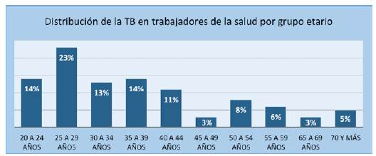 En el periodo estudiado, se encontró que el rango de edad afectado por la TB fue entre los 20 y los 86 años, con una media de 37,7 años. El grupo etario más afectado fue entre 25 a 29 años, lo cual coincide con Mongui et al.9, quienes reportan que existe mayor incidencia en el mismo grupo y con Chu et al.10, donde reportaron que el riesgo de TB fue mayor en los trabajadores de la salud menores de 30 años de edad. Por el contrario, los datos del presente estudio difieren de Mukuku et al.11, quienes en su estudio llevado a cabo en Burundi (África), muestran que la incidencia de la TB fue significativamente más grande entre los trabajadores de mayor edad (mayores de 50 años), al igual que en el estudio de He GX et al.12, quienes reportan que la edad avanzada se asoció significativamente con la infección por TB.