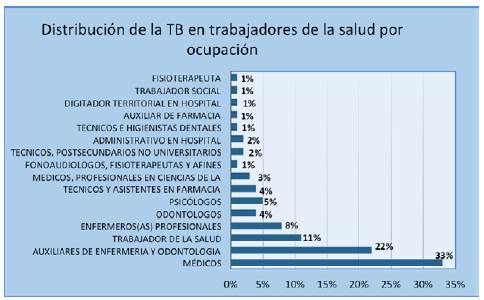 Resultados.: Se identificaron 100 casos de TB en trabajadores de la salud, siendo los más afectados los médicos, profesionales del género femenino y los trabajadores con edades comprendidas entre los 25 y 29 años. El 56% correspondieron a TB extrapulmonar y se evidenciaron 15 casos de co-infección TB/VIH. La mayoría de los casos terminaron el tratamiento, sin embargo, hubo 4 casos de fallecimiento.