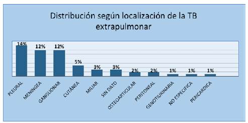 El 56% de los casos corresponden a TB extrapulmonar, y 44% a TB pulmonar. La distribución según la localización de la TB extrapulmonar se muestra en la gráfica 3.