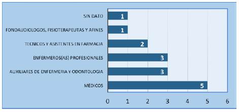 Los trabajadores de la salud más afectados fueron los médicos (33 casos); auxiliares de enfermería y odontología (22 casos), y enfermeros(as) profesionales (8 casos). Las demás ocupaciones afectadas se muestran en la gráfica 2.