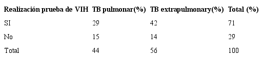 En cuanto a las pruebas de VIH, se evidenció que en 29 casos no se realizó la prueba; 14 fueron pacientes con TB y estado de VIH desconocido, lo cual es preocupante teniendo en cuenta la vulnerabilidad de estos trabajadores, puesto que el impacto de la coinfección VIH y TB es bidireccional. Si bien la prueba de VIH se realiza de manera voluntaria, es fundamental la asesoría y oferta de la prueba a toda persona con diagnóstico de TB28.