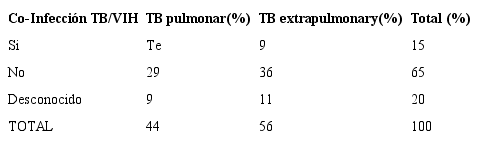 Methods.: It has been identified one hundred cases with TB in the health workers, being most affected doctors, female workers and ages between 25 and 29 years. The 56% corresponded to extrapulmonary TB and it show 15 cases of co-infection TB/HIV.
