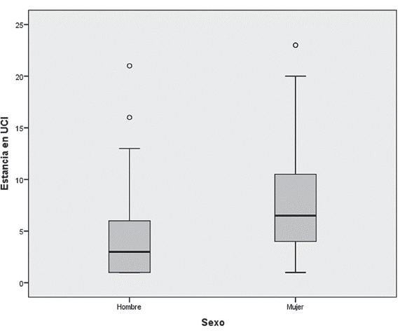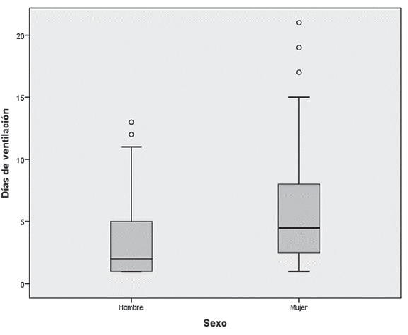 Se encontró mayor estancia en UCI en las mujeres (p=0,02; ver Figura 1) y los días de ventilación mecánica (p=0,03; Ver Figura 2). No se encontraron diferencias en las variables continuas para la variable tipo de aseguramiento (p>0,05; prueba de Kruskal-Wallis).