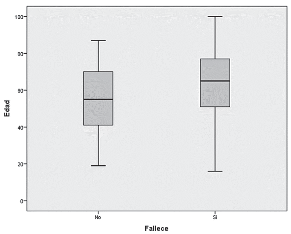 Se encontraron diferencias en las proporciones de mortalidad en el tipo de ingreso por cirugía programada (p=0,035), los pacientes de los servicios de cirugía (p=0,035), gineco-obstetricia (p=0,085) y medicina interna (p=0,055). También se encontró significancia en otras variables como la NAV (0,011) y la recepción de ventilación mecánica (p=0,001), (Ver Tabla 4). Con los pacientes del servicio de medicina interna se encontró un valor cercano de significancia (p= 0,055).