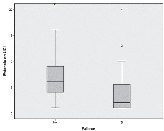 Plan de análisis: el análisis estadístico se realizó en el programa SPSS versión 15. Se realizaron pruebas de estadística descriptiva en las que se evaluó la frecuencia y proporción de las variables categóricas, así como la tendencia central y dispersión de las variables continuas. En el análisis bivariado se compararon los resultados de las variables y la asociación de las variables independientes con los desenlaces con el fin de encontrar los factores asociados con la mortalidad y el tiempo de estancia en UCI. Las variables de estudio fueron: