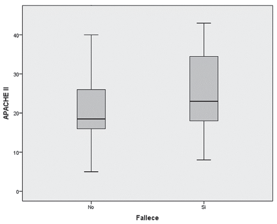 La letalidad encontrada fue alta (32,1%), con una gravedad alta que se evidencia en el puntaje de APACHE II (19,8 ± 9,4) y de intervención TISS-28 (21,3 ± 8,4). Cerca del 16% de los pacientes fallecieron de forma temprana (<48 horas).