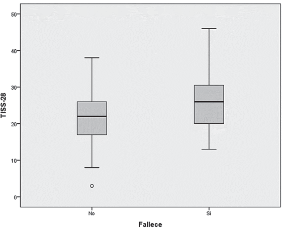 La UCI del Hospital de Granada es una unidad semi-cerrada, con 10 camas, que tiene como fundamento el manejo del paciente crítico por médicos especialistas (cirujanos e internistas) presenciales 24 horas al día, con el acompañamiento de un médico general 23. La relación de pacientes por enfermera es 2:1 24. El cálculo del puntaje APACHE II es realizado por el médico a las 24 horas del ingreso. El cálculo del puntaje TISS-28 es realizado por la enfermera diariamente. Estas rutinas explican el hallazgo de puntajes bajos (7 registros), debido al fallecimiento de pacientes antes de cumplir las primeras 24 horas, pero que no permiten asociar esta muerte con la gravedad, lo cual pudiera significar que los puntajes podrían ser aún mayores. Estos valores fueron excluidos de los análisis para evitar hallazgos confusos. La mortalidad esperada para pacientes con APACHE II de 19 es alrededor del 29%, lo cual fue similar a la encontrada en la unidad.