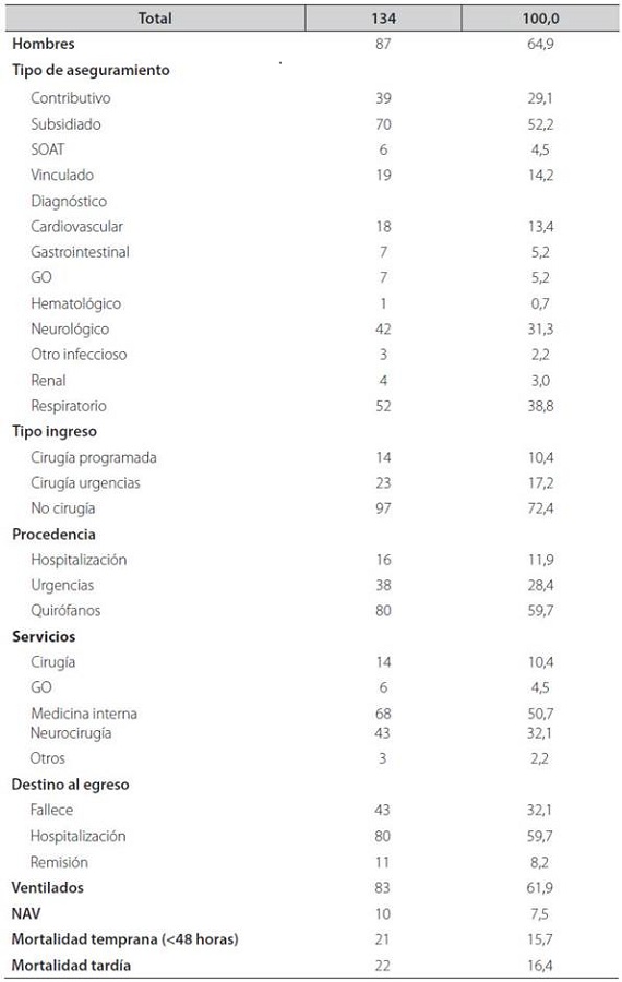 Durante el periodo de estudio 138 pacientes egresaron de la unidad de cuidados intensivos, entre los cuales se incluyeron 134 en el estudio debido a la falta de registros suficientes en 4 de ellos; la mayoría de los pacientes fueron hombres (64,9%) con un promedio de edad de 54,8 ± 20,8 años.