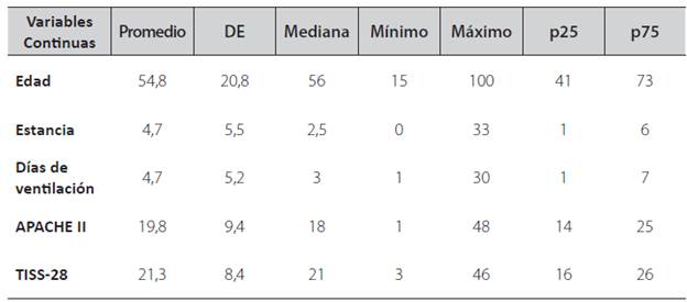 Variables independientes: sexo, edad, tipo de ingreso, diagnóstico, servicio de procedencia, especialidad, puntaje de gravedad APACHE II, puntaje de intervención TISS-28, ventilación mecánica, días de ventilación mecánica, neumonía asociada a la ventilación, asegurador, tipo de aseguramiento, destino.