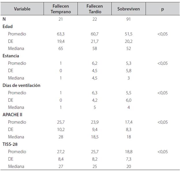 El puntaje APACHE II y el TISS-28 fueron mayores en los que fallecieron de forma tardía o temprana, al igual que el tiempo de estancia (Ver Tabla 3).