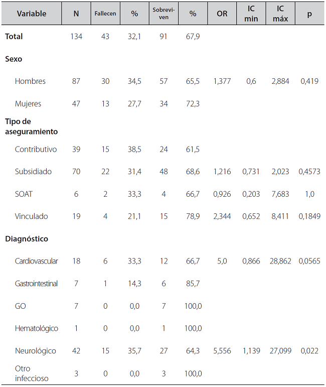 En el análisis de las variables categóricas se encontró mayor riesgo de mortalidad en los pacientes con diagnóstico cardiovascular, neurológico, respiratorio y aquellos procedentes de hospitalización o de los servicios de medicina interna o neurocirugía, al igual que aquellos que requirieron ventilación mecánica o desarrollaron neumonía asociada a esta (p<0,05).