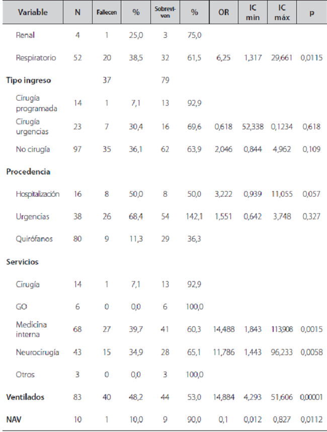 Al comparar las variables independientes con los desenlaces se encontró que hubo mayor mortalidad en los pacientes con diagnóstico cardiovascular, neurológico, y respiratorio; los ingresados procedentes de hospitalización, de las especialidades de medicina interna, neurocirugía o los que tuvieron fueron sometidos a ventilación (p<0,05), (Ver Tabla 4).