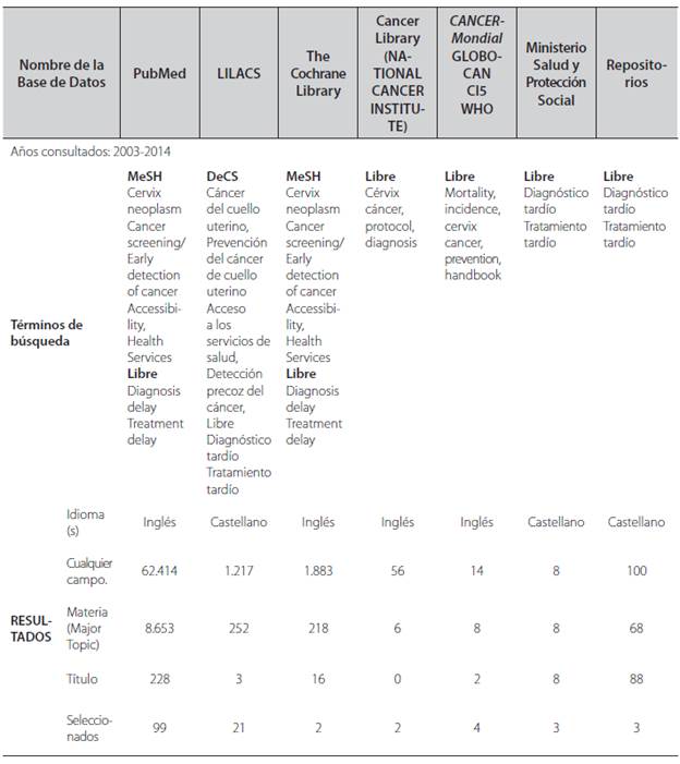 Para la búsqueda de artículos científicos publicados entre enero de 2003 y junio de 2014 se consultaron varias fuentes de información: bases de datos Pubmed y LILACS; la red global independiente The Cochrane Library y la Cancer Library de (National Cancer Institute of National Institutes of Health) de los Estados Unidos; el sitio web CANCERMondial que contiene las bases de datos GLOBOCAN, Cancer Incidence in Five Continents (CI5) y World Health Organisation (WHO) manejada por la Sección de Vigilancia del Cáncer de la International Agency for Research on Cancer (IARC), la Biblioteca del Ministerio de Salud y Protección Social y Tesis de Repositorios de la Universidad Nacional de Colombia y Universidad de Antioquia en Tabla 1.
