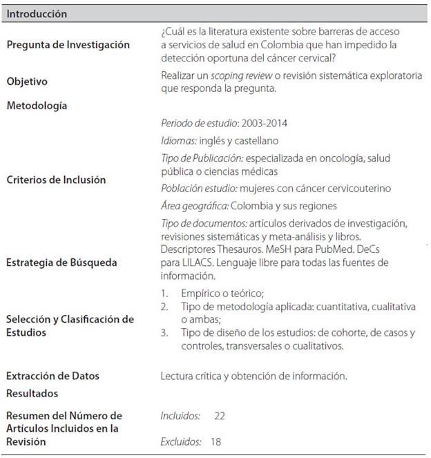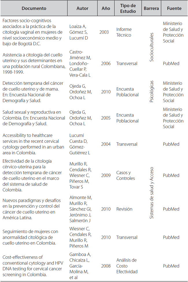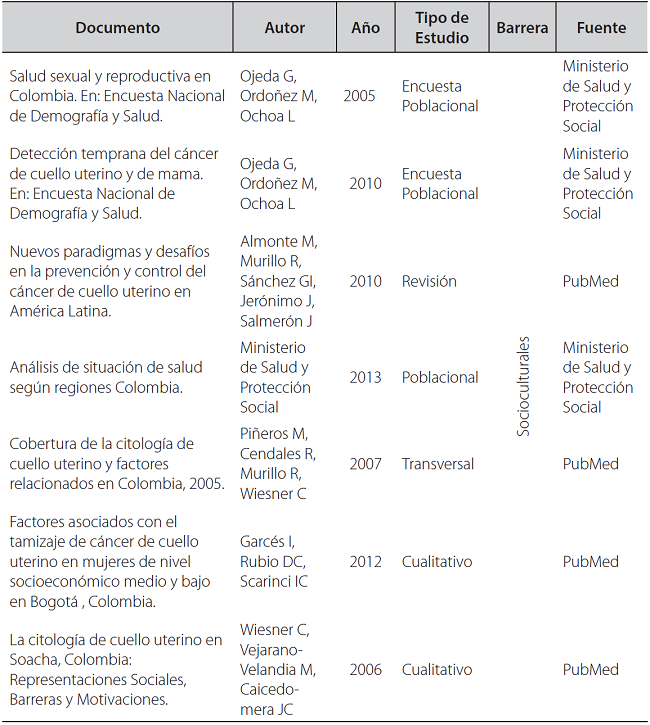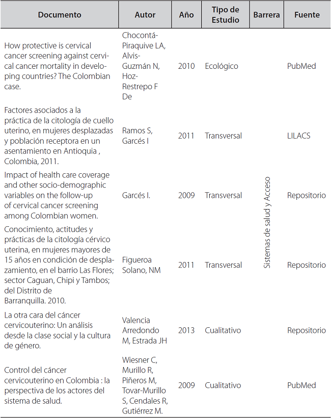 Conclusions. : Few studies that demonstrated the existence of barriers related to the opportunity to make decisions and take actions, access to health care and quality of health care for cervical cancer in Colombia were found.