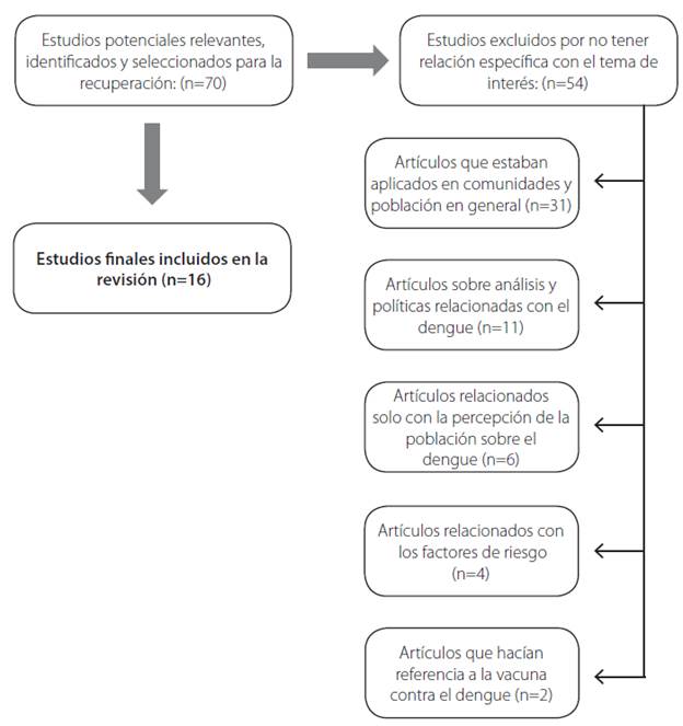 La búsqueda arrojó un listado de 70 documentos. La selección inicial se realizó con la lectura de las publicaciones que contenían los descriptores establecidos para la búsqueda, luego se dio lectura a cada artículo, excluyendo 6 artículos que estaban relacionados solo con la percepción de la población sobre el dengue y no con los conocimientos, actitudes y prácticas de los escolares. De los 64 artículos se excluyeron 2 que hacían referencia a la vacuna contra el dengue, 4 artículos relacionados únicamente con los factores de riesgo; 31 artículos relacionados con estudios en población y comunidades en general, es decir, sin una clasificación o énfasis específico y 11 artículos relacionados con políticas públicas. Finalmente se obtuvieron 16 artículos (Figura 1).