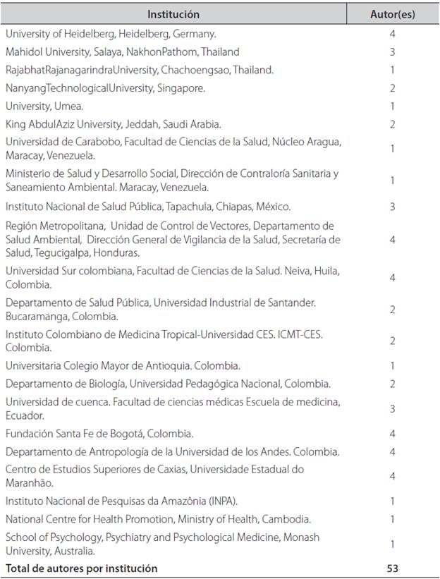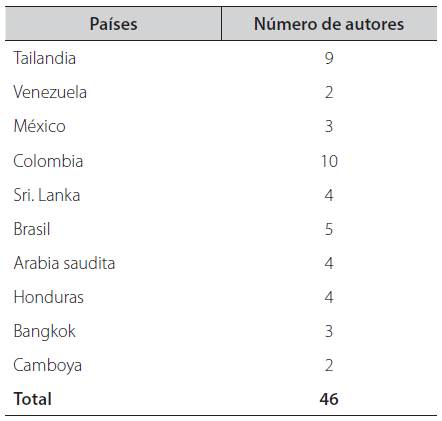 De las publicaciones identificadas (Tabla 1), el 62,5% de los estudios (10 artículos) se realizaron entre los años 2010 y 2014. En relación con el idioma, los artículos publicados en idioma inglés (n=8, 50%) en español (n=8, 50%). Los países que publicaron más artículos correspondieron a Tailandia y Colombia, cada uno con un total de 4 artículos (25%). De igual forma se hizo un análisis de los países representados y número de autores por país, lo cual arrojó una totalidad de 46 autores en 10 países (Tabla 2). El país con mayor número de autores implicados en las investigaciones fue Colombia con un total de 10 autores (21,73%) (Tabla 2). Se hizo un listado de las instituciones representadas y número de autores por institución y se obtuvo un total de 53 autores de 22 instituciones (Tabla 3).