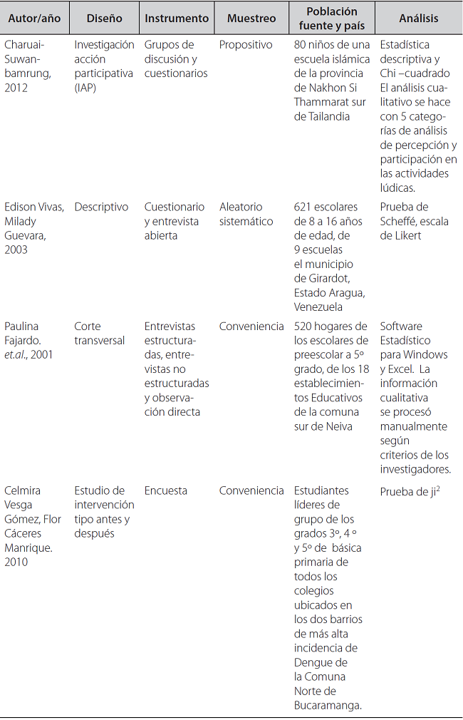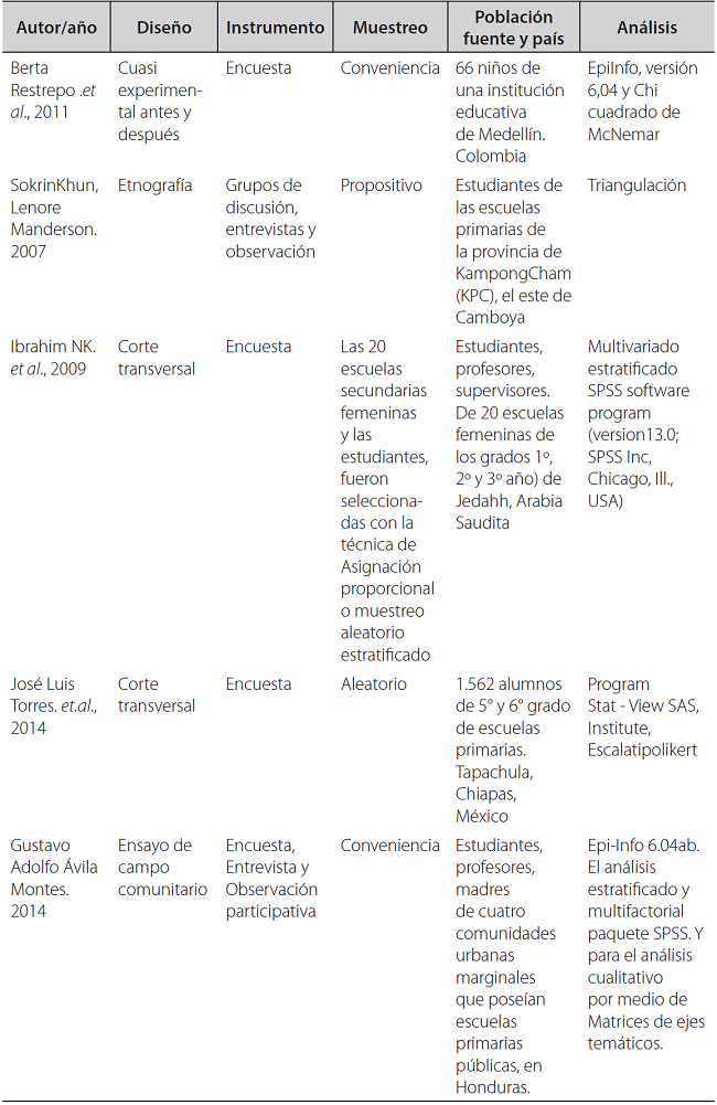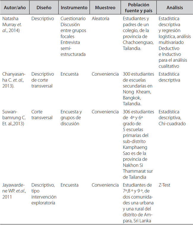 Los artículos incluidos fueron 7 (43,75%) en el sudeste asiático, de los cuales cuatro fueron llevados a cabo en el sur de Tailandia: en la provincia de Chachoengsao 3, en el subdistrito de Kamphaeng Sao 10, provincia de Nakhon Si Thammarat 11, y en Bangkok 12; otro estudio fue llevado a cabo en Sri. Lanka 13; uno en la ciudad de Jeddah en Arabia Saudita 9; Y otro en Camboya 14. A nivel de Latinoamérica se incluyeron un total de 5 artículos (31,25%) de países como Venezuela 15, Brasil 16, México 17, Honduras 18, y Ecuador 19. En Colombia se contó con 4 artículos (25%), en las ciudades de Neiva 20, Bucaramanga 21, Medellín 22 e Ibagué 23. Es importante tener en cuenta que la totalidad de países incluidos fueron países en vías de desarrollo. De los 16 artículos, se evidenció que el 43,75% fueron estudios de enfoque mixto o cualitativos (7 artículos), y el 56,25 % eran estudios del paradigma empírico-analítico (9 artículos) (Tabla 4).