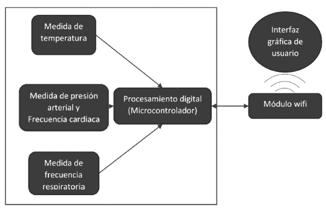 En la figura 1 se observa un diagrama de bloques que describe las diferentes etapas de las cuales se conforma el prototipo, desde el sensado de las diferentes variables hasta la visualización y envío de las medidas a la interfaz de usuario para realizar la gradación de triaje a los pacientes (figura 1).