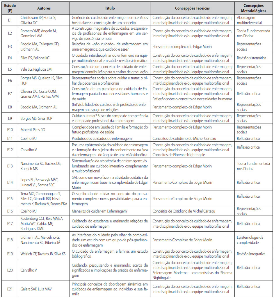 Após a seleção dos artigos, encontramos as seguintes concepções teóricas: 7 artigos baseados no referencial de complexidade segundo Edgar Morin; 12 abordaram a construção do conceito de cuidado de enfermagem, interdisciplinaridade e/ ou equipe multiprofissional ressaltando a importância com o ambiente e com a organização dos cuidados de Enfermagem de Florence Nightingale e as necessidades humanas básicas de Wanda Aguiar Horta; e 2 sobre as influencias do cotidiano de Michel Certeau na determinação do cuidado a ser prestado.