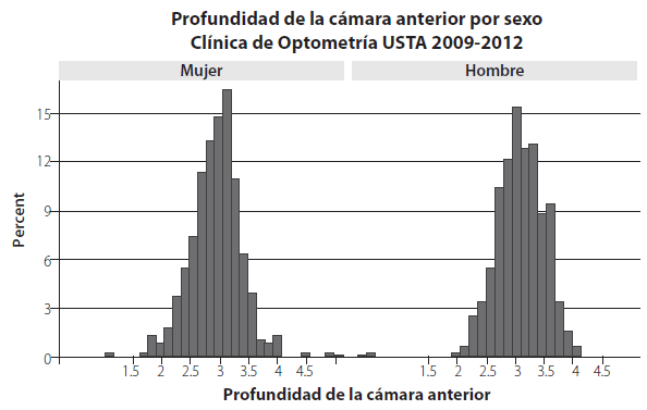 Los pacientes a quienes se les realizó examen a través de la Pentacam HR en la Universidad Santo Tomás en el período 2009 a 2012, tenían, a la fecha de la toma, edades entre los 3 años y 83 años, con una mediana de 26 años. Esto difiere con las edades promedio de los estudios donde se analiza la cámara anterior a través de la Pentacam. Los participantes de dichos estudios se clasificaron por medio de la gonioscopía, inicialmente en dos grupos de muestra, un grupo de sujetos con ángulo cerrado y un segundo grupo de sujetos con ángulo abierto, con un rango de edad que se encontraba entre los 30 y los 83 años y con un promedio de edad o medianas entre los 51 y los 67 años, haciéndose necesario examinar sujetos de edades más avanzadas para obtener los dos grupos de muestra necesarios 11,13,16,18,20. En cambio, en el presente estudio se encontró similitud de las edades de los sujetos con respecto a las investigaciones donde no se hace una clasificación previa de los pacientes con ángulo de la cámara anterior cerrada o abierta, estudios que comprendían sujetos con edades promedio o medianas, entre los 30 y los 36 años 9,15,21,22.