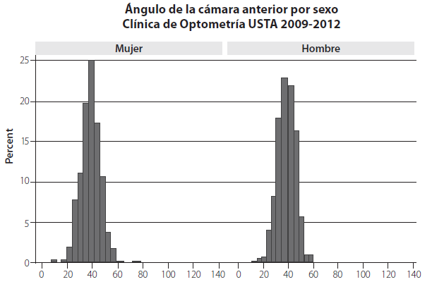 La amplitud del ángulo en un ojo sano es de aproximadamente 30°, con la parte superior, por lo general, menos amplia que la mitad inferior. Sin embargo, la profundidad se ve influenciada por el género, la edad y el error refractivo. El Glaucoma primario de ángulo cerrado tiene diferentes factores de riesgo, el sexo femenino tiene la mayor influencia en la reducción del ángulo iridocorneal, a una razón de 4:1 frente a los hombres, seguido por la edad, con una media alrededor de 60 años y el equivalente esférico, refiriéndose a la hipermetropía, ya que esta está asociada a ojos cortos, que se acompañan de diámetro corneal pequeño y cristalino localizado relativamente anterior 19. La mediana de la ACD en el presente estudio en las mujeres fue de 2.98 mm y en los hombres 3.07 mm. La mediana del ACA en las mujeres fue de 37.4° y en los hombres 39.7° y la mediana del ACV en las mujeres fue de 160 mm3 y en los hombres 171 mm3. Las tres variables con diferencias estadísticamente significativas por sexo, correlacionándose con lo descrito en la literatura frente al sexo como factor de riesgo.