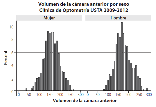 La mediana del volumen de la cámara anterior para las mujeres fue de 160 mm3 (RIC 135 a 185) y para los hombres de 171 mm3 (RIC 149.5 a 201), con un valor mínimo para mujeres de 34 mm3 y un máximo de 265 mm3 y para hombres con un valor mínimo de 85 mm3 y un máximo 294 mm3 (figura 3). De acuerdo con la prueba U de Mann-Whitney, fueron estadísticamente significativas las diferencias de las medianas del volumen de la cámara anterior entre hombres y mujeres, ya que obtuvieron un valor de p<0.05.