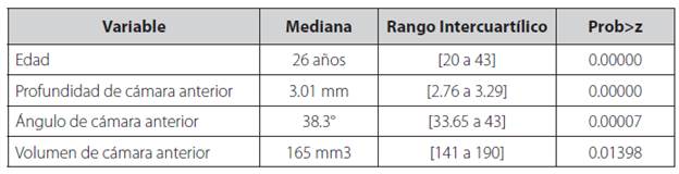 Resultados: Mediana de la profundidad de la cámara anterior: en mujeres 2.98 mm y hombres 3.07 mm, mediana del ángulo de la cámara anterior: mujeres de 37.4° y hombres 39.7° y mediana del volumen de la cámara anterior: mujeres 160 mm3 y hombres 171 mm3; las tres variables con diferencias estadísticamente significativas por sexo.