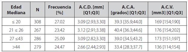 En los pacientes de la USTA 2009-2012, la mediana del ACA fue de 38.3°, medición similar al encontrado en pacientes entre 20 y 40 años en estudio realizado por Domínguez-Vicent A et al.21 cuyo promedio fue de 39.26°. En la distribución por cuartiles, la mediana de los mayores de 44 años obtuvo el ángulo de menor valor con 33.4°, muy similar a la del estudio por Hashemi H et al.26 realizado en población con edades entre 40 y 64 años de edad, donde el promedio encontrado de ACA fue de 34.3° y al estudio realizado por Alonso R et al.18 en pacientes con edad promedio de 51 años, donde el promedio encontrado fue de 35°. En el presente estudio se determinó que la mediana del ACV fue de 165 mm3, y en la distribución por cuartiles la mediana de los mayores de 44 años obtuvo el volumen de menor valor con 136 mm3, muy similar a estudio por Hashemi H et al.26 realizado en población con edades entre 40 y 64 años de edad, donde el promedio encontrado de ACV fue de 139 mm3.