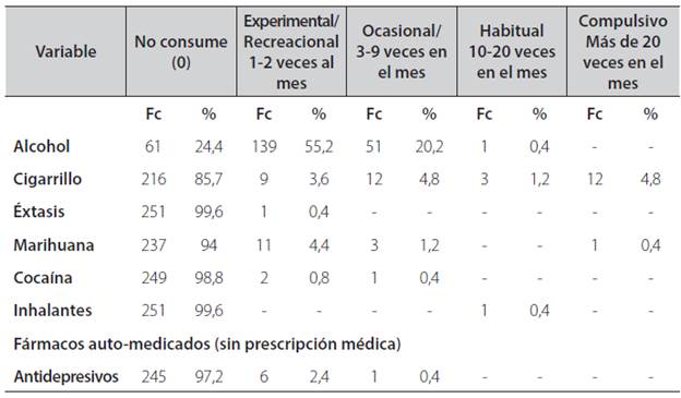 Discussion: The social representation of consumption can influence the frequency of consumption, perhaps that is why alcohol is the most consumed substance, tobacco and marijuana in a less proportion, possibly due to the social stigmatization that produces their consumption.