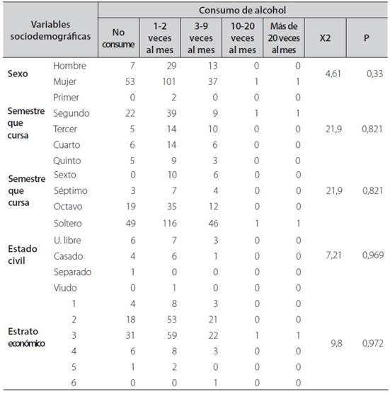 Se realizó el cruce de variables socio-demográficas con el consumo de alcohol por ser de las sustancias que más se consumían en los estudiantes universitarios, en cada uno de los cruces se evidenció que no hay asociación estadísticamente significativa en ninguno de los cruces.