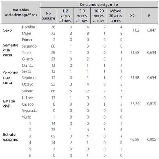Este cruce de variables socio demográficas en relación al consumo de cigarrillo mostró asociación estadística con sexo, estado civil y estrato socioeconómico.