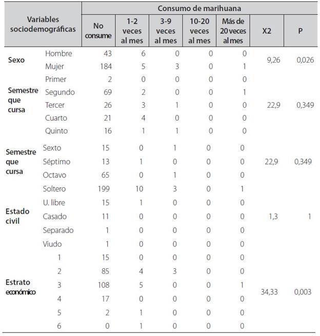Estos cruces evaluaron la asociación de las variables sociodemográficas con el consumo de sustancias como la marihuana, por ser de las sustancias que más se consumían en los estudiantes universitarios; en cada uno de los cruces se evidenció asociación estadística en sexo y estrato socioeconómico.