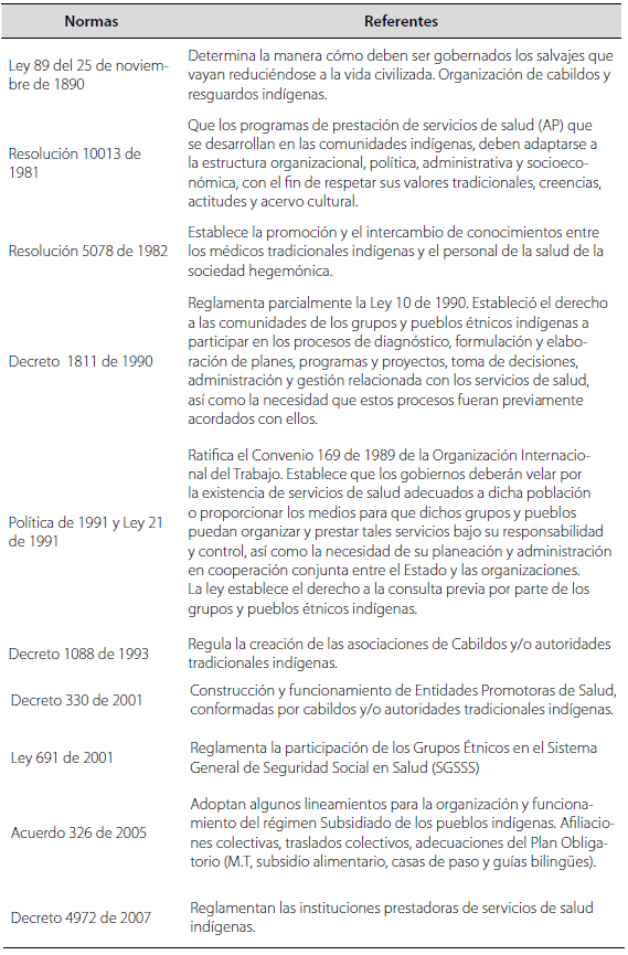 En términos de salud debe señalarse que para el país solo hasta la Ley 691 de 2001 hubo claridad acerca de la vinculación de los pueblos indígenas al Sistema General de Seguridad Social en Salud. En esta se incorpora la población al régimen subsidiado, y se otorga la posibilidad de que las organizaciones indígenas debidamente soportadas conformen entidades promotoras de salud e instituciones prestadoras de servicios de salud propias 19. Distintos instrumentos (Tabla 1) posteriores destacan la necesidad de introducir la interculturalidad como un eje central de las acciones de salud tanto del Plan Obligatorio de Salud como del Programa de Intervenciones Colectivas, siendo materializado en el Plan Decenal de Salud Pública, en los componentes especiales de aceptabilidad e interculturalidad de la Ley Estatutaria en Salud, y más recientemente, con la reglamentación del Sistema Indígena de Salud Propia e Intercultural - SISPI - en el Decreto 1953 de 2014.