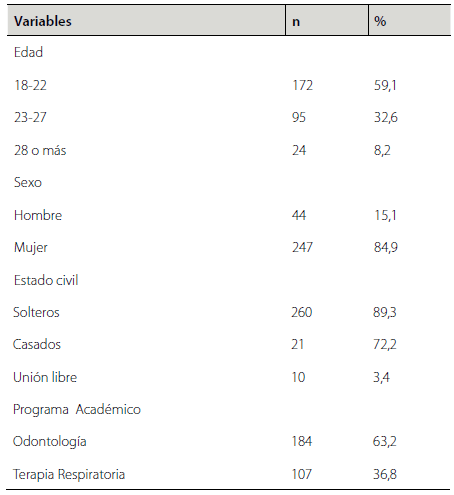 La población estuvo conformada por 291 estudiantes, quienes tenían una edad promedio de 22,7 años (DE=3,6 años). El 63,2%(184) correspondían al Programa de Odontología y el 36,8%(107) al Programa de Terapia Respiratoria. La frecuencia por sexo indicó que el 84,9% (247) eran mujeres. Con relación al estado civil se encontró que el 89,3%(260) eran solteros.