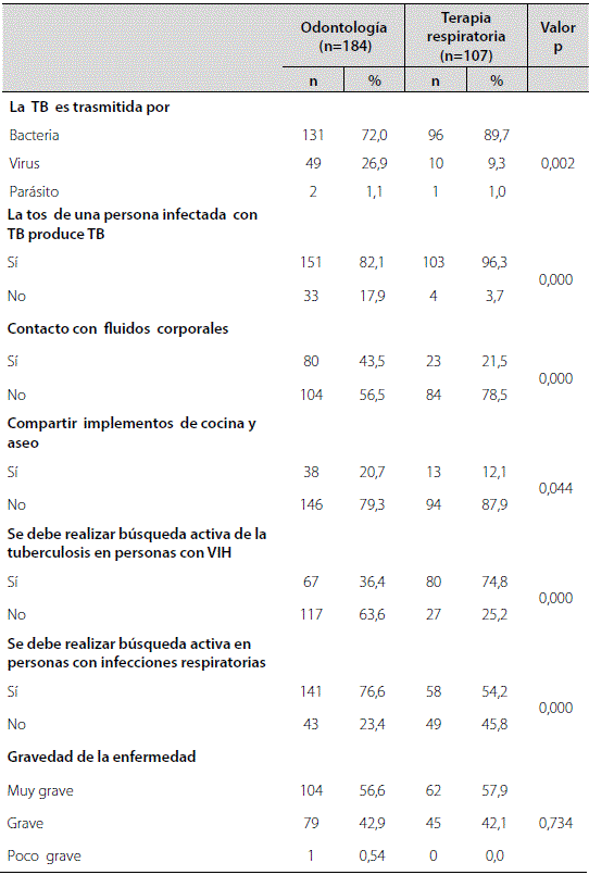 Results: 57.7% of dentistry students and 42.3% of respiratory therapy students consider that tuberculosis is transmitted by a bacterium, and if cough is considered a transmission mechanism, 89.2% of dentistry students said that it was and 10.8% of the therapy students answered no.