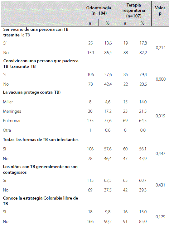 Methods: A descriptive study was carried out with 291 students from the dentistry and respiratory therapy programs of a higher education institution in the city of Medellín, who were in clinical practice at the time of the study. They answered a survey based on sociodemographic information, knowledge and attitudes regarding the transmission of tuberculosis. A descriptive and bivariate analysis was carried out.