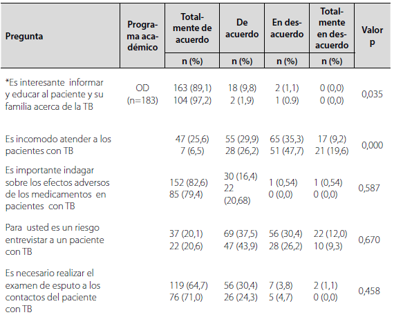 En cuanto a las actitudes que tienen los estudiantes sobre la transmisión de la TB, según el programa que estudian, se encontró que el 97,2% de TR está totalmente de acuerdo con que es interesante informar y educar al paciente y su familia acerca de la TB. El 25,6% de los de OD dice que está totalmente de acuerdo con que es incómodo atender a los pacientes con TB, mientras que el 19,6% de los estudiantes de TR dice que están totalmente en desacuerdo con esa afirmación. (p=0,0035 y 0,000 respectivamente).