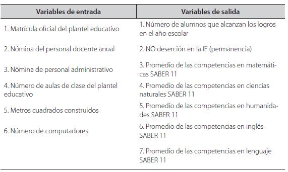 Este estudio estuvo orientado a evaluar y analizar la eficiencia y la productividad de todas las instituciones educativas del distrito de Barranquilla durante el periodo 2012-2013, la selección de los insumos o variables de entrada y de los productos o variables de salidas representaba una tarea de mucho cuidado, ya que la calidad de los resultados estaba sujeta a una buena selección de estas variables. Por este motivo, se inició un proceso exhaustivo para identificar los recursos y productos que caracterizaban el sector educativo oficial de la ciudad de Barranquilla. Se consultaron los trabajos empíricos en esta área, que eran comparables para definir inicialmente el grupo de variables, para luego validarlas con personas con experiencias y formación en el área de la educación.