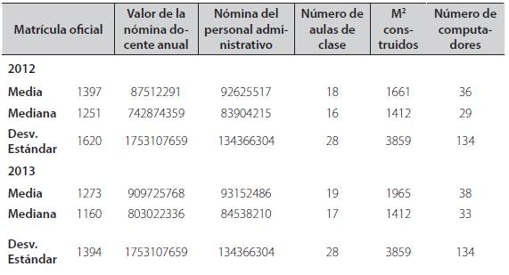 Los datos de las variables de entrada (matrícula oficial, número de aulas de clase, metros cuadrados de área construida, número de computadores) así como la información para determinar los valores de las variables de salida (número de alumnos que alcanzan los logros y no deserción o permanencia) fueron tomados de las bases de datos de la SED y de las visitas a las instituciones educativas. Los valores de las nóminas anuales de personal docente y administrativo se determinaron teniendo en cuenta la asignación salarial para el escalafón de la planta docente de cada IED, como lo reglamenta el Departamento Administrativo de la Función Pública a través de los Decretos 1055 y 1027 del 4 de abril de 201125,26, por medio de los cuales se modifican las remuneraciones de los servidores públicos docentes y directivos docentes. Se manejaron pesos constantes para cada año.