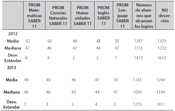 En la Tabla 4 se muestran los resultados de eficiencia para los años 2012 y 2013, asimismo, los índices de productividad para cada una de las instituciones educativas estudiadas durante este periodo.